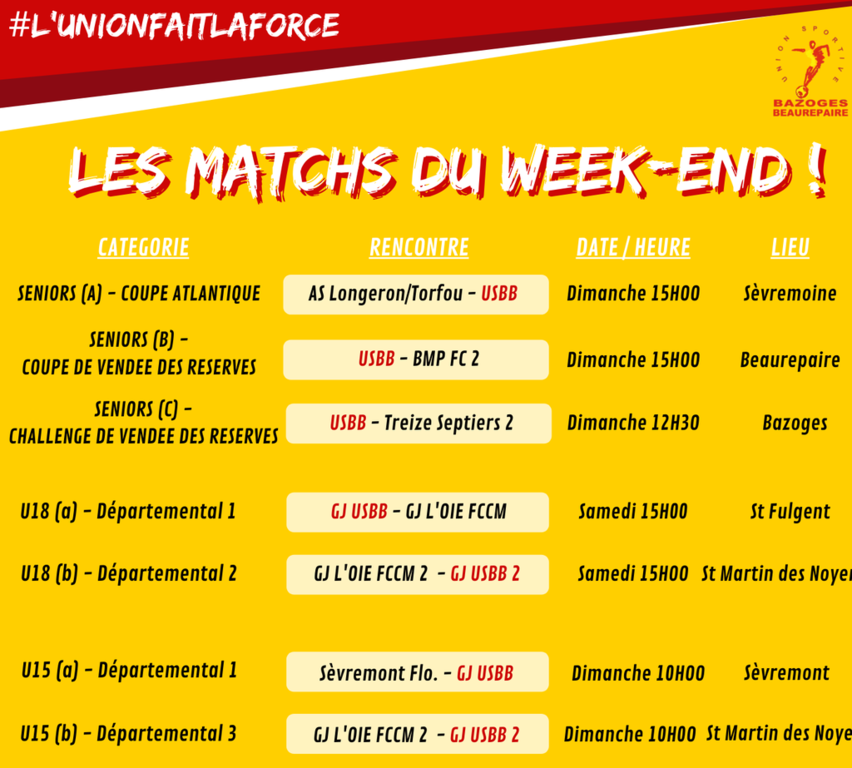 LES MATCHS DU WEEK-END Reprise du championnat pour nos équipes jeunes ! 2ème Tour de Coupe Atlantique pour les seniors A qui affrontent l'AS Longeron/Torfou (D1) ! Entrée en lice des Seniors B et C respectivement en Coupe et Challenge ! Bon match à tous !